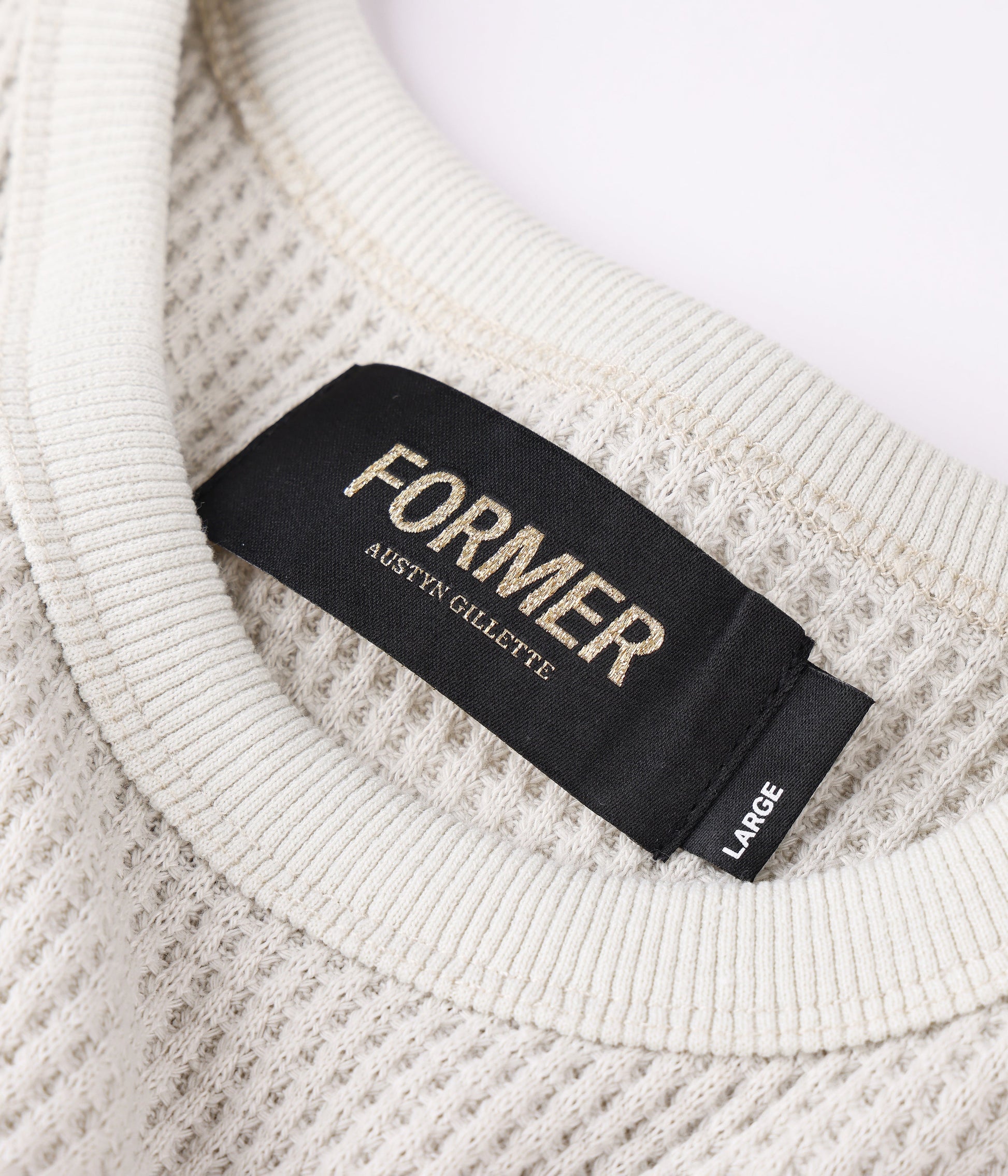 Crafted in a premium cotton-polyester blend (35% cotton 65% polyester) waffle construction and designed in collaboration with FORMER founder Austyn Gillette. Delivered in our AG waffle fit featuring Franchise F logo embroidery on hip and knitted rib hem and collar.